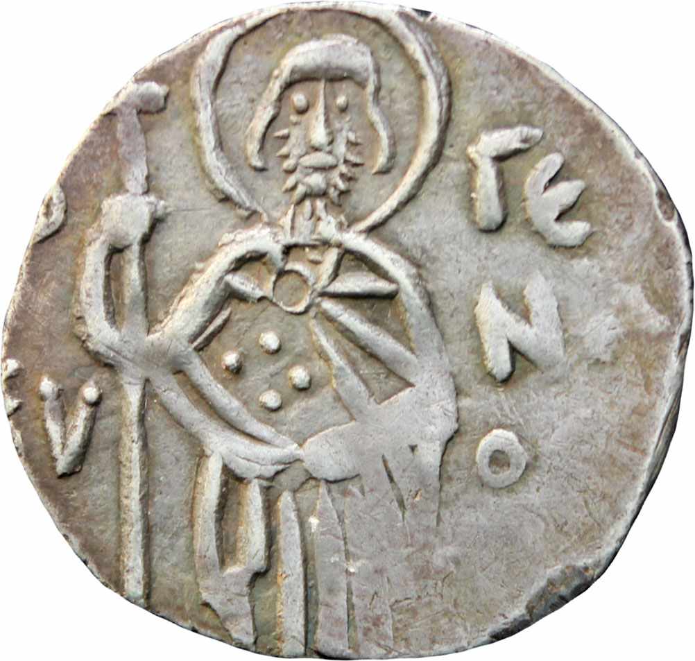 Obverse: standing facing figure of Saint Evgenius holding long cross in right hand.