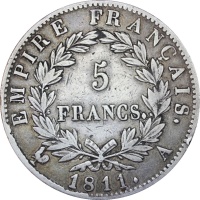 Reverse legend: “EMPIRE FRANÇAIS. 5 FRANCS. 1811. A”
