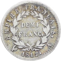 Reverse legend: “EMPIRE FRANÇAIS.DEMI FRANC. 1812. A”