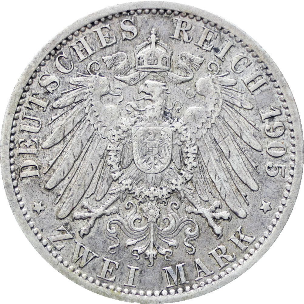 Reverse legend: “DEUTSCHES REICH 1905 * ZWEI MARK *”