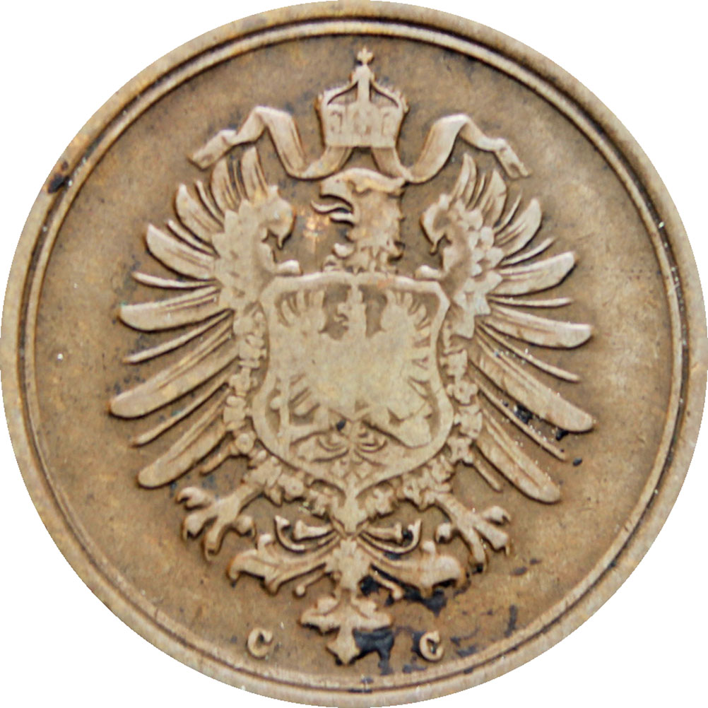 Reverse legend: “DEUTSCHES REICH 1875 1. PFENNIG. ”