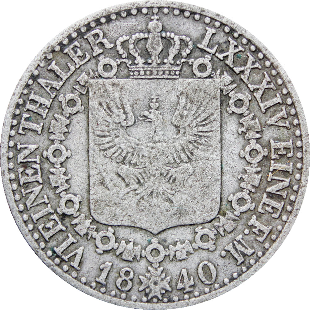 Reverse legend: “VI. EINEN THALER LXXXIV. EINE F.M. 18 40”