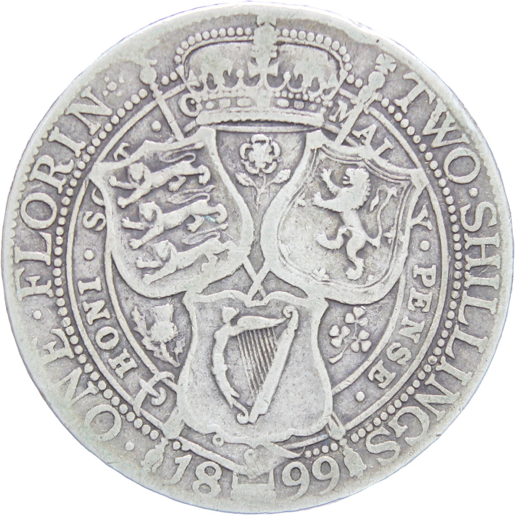 Reverse legend: “ONE•FLORIN+ TWO•SHILLINGS • 18 99 •HONI • SO T • Q MAL Y • PENSE •”