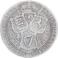 Reverse legend: “ONE•FLORIN+ TWO•SHILLINGS • 18 99 •HONI • SO T • Q MAL Y • PENSE •”
