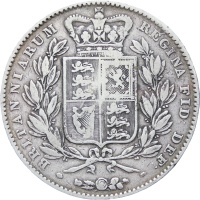 Obverse: Head of the Queen facing left wearing ribbon in hair; in small letters on neck truncation the artist's name W. WYON R.A.; around, VICTORIA DEI GRATIA; below, 1845