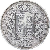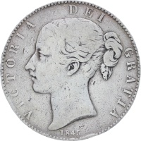 Obverse: Head of the Queen facing left wearing ribbon in hair; in small letters on neck truncation the artist's name W. WYON R.A.; around, VICTORIA DEI GRATIA; below, 1845