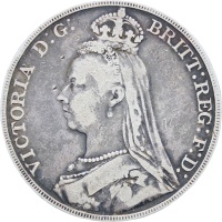 Obverse: Bust of the Queen facing left the small wearing imperial crown, long veil falling behind her head, pearl necklace and earring, Ribbon and Star of the Garter and the badge of the Imperial Order of India; in small raised letters on the bust truncation, the artist's initials J.E.B. (Joseph Edgar Boehm); around, VICTORIA D:G: BRITT: REG: F:D: