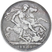 Reverse: St George on horseback advancing to right wearing a helmet and cape and holding a sword; below horse, fallen dragon with lance in its side; below exergue line at right the artist's initials B.P. (Benedetto Pistrucci); in exergue, 1889