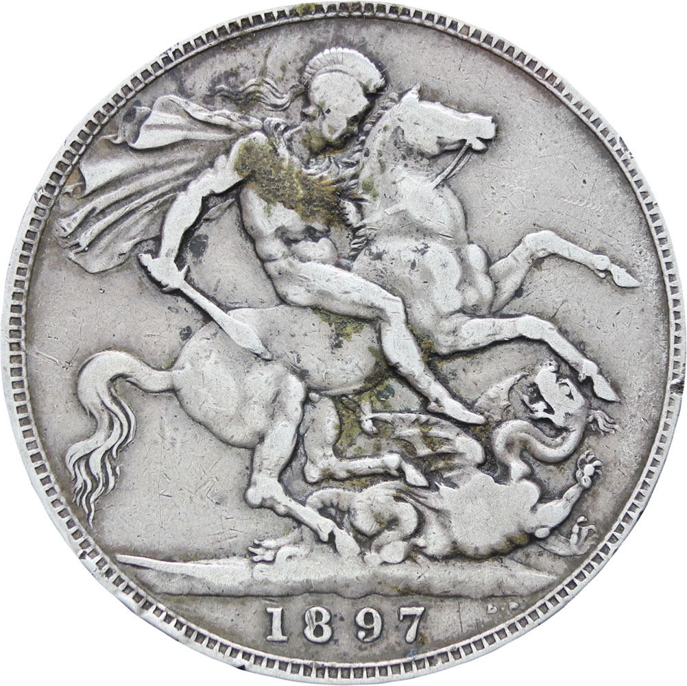 Reverse: St George on horseback advancing to right wearing a helmet and cape and holding a sword