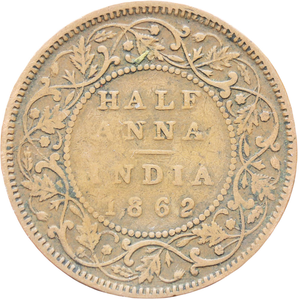 Reverse legend: “HALF ANNA INDIA 1862”