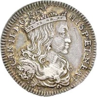 Crowned bust, armored and draped, to the right of Charles II; signature below.