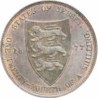 Reverse legend: “STATES OF JERSEY. 18 77 ONE TWENTY-FOURTH OF A SHILLING.”