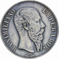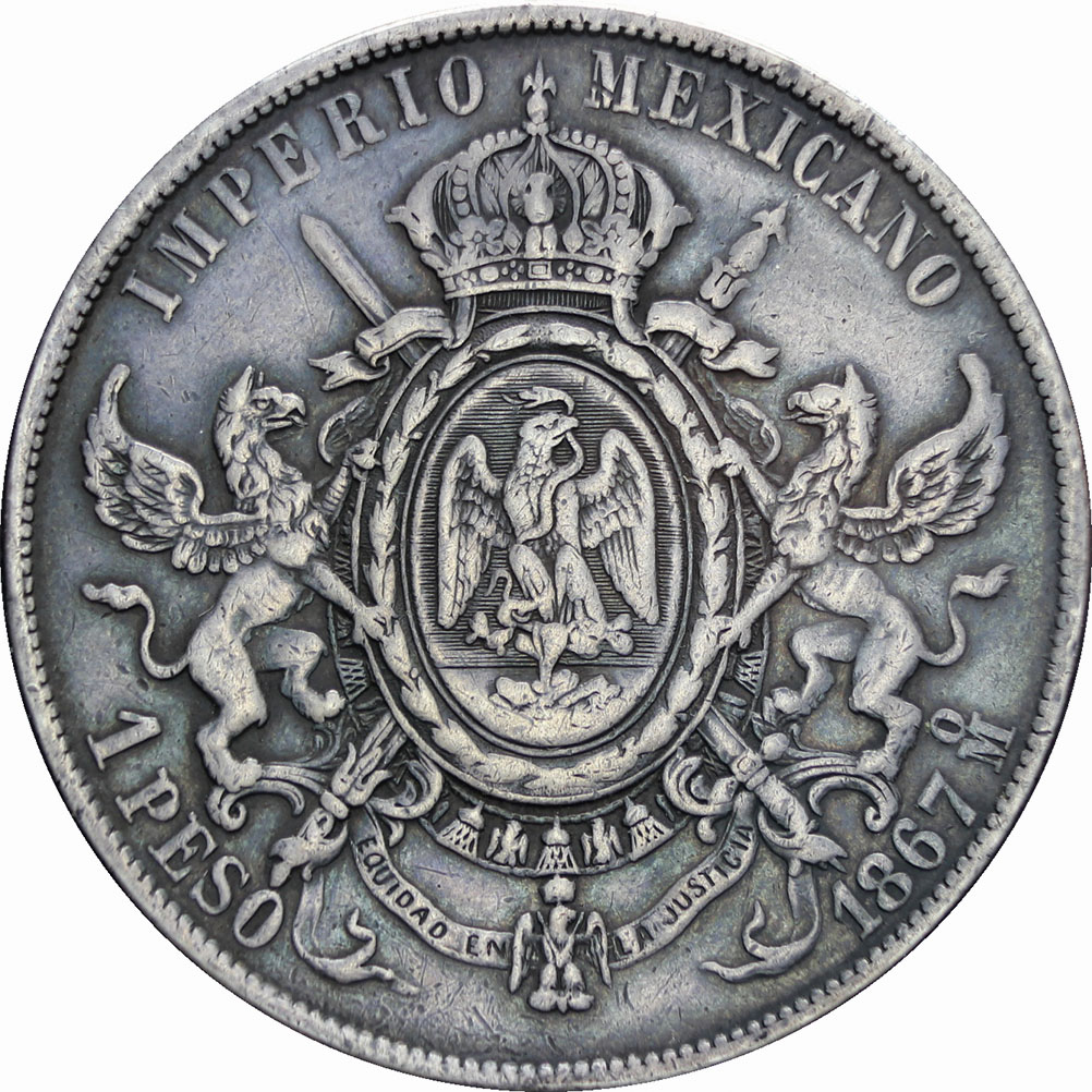 Reverse legend: “IMPERIO MEXICANO 1 PESO 1867 Mo EQUIDAD EN LA JUSTICIA”