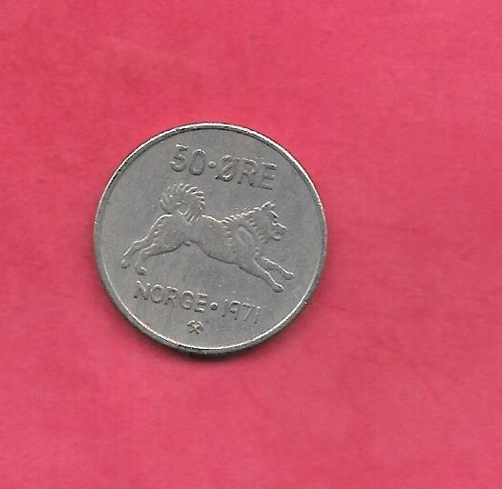 NORWAY NORWEGIAN KM408 1971 VF-VERY FINE-NICE CIRCULATED OLD 50 ORE DOG COIN