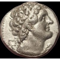 PTOLEMAIC KINGS of EGYPT. Ptolemy VI Philometor. Second sole reign, 163-145 BC. AR Tetradrachm (26mm, 13.97 g, 12h). Salamis mint. Dated RY 21 (161/0 BC). Diademed head of Ptolemy I right, aegis around neck / Eagle standing left on thunderbolt; LK (date) to left, ΣA to right. Svoronos 1344 and 1453; Olivier 335–8 (obv. die D73); SNG Copenhagen –; DCA 47. Toned, flan crack. Good Very Fine.