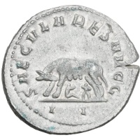 Philip I (244-249). AR Antoninianus, Rome mint, 248 AD. Obv. IMP PHILIPPVS AVG. Radiate, draped and cuirassed bust right. Rev. SAECVLARES AVGG. She-wolf, standing left, suckling the twins. RIC IV 15. AR. 4.03 g. 23.5 mm. About EF.