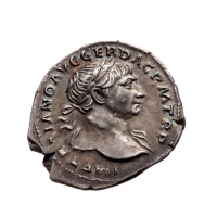 Trajan AD 98-117. Rome Denarius AR 20mm., 3,14g. IMP TRAIANO AVG GER DAC P M TR P, laureate head of Trajan right, with aegis / COS V P P S P Q R OPTIMO PRINC, Victory standing left on pile of shields, wreath upward in right hand, palm in left. very fine RIC 129 var. (drapery on left shoulder).