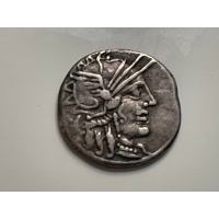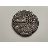 Gens Papiria. Denarius (circa 121 BC). (Bab. 7) (Craw. 279/1). Obv.: Galliard head of Roma, behind C. Rev.: CARB. ROMA. Jupiter throwing thunderbolt and holding scepter, in a galloping quadriga. 3.86 g.