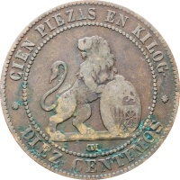 Reverse legend: “DOSCIENTAS PIEZAS EN KILOG.DIEZ CENTIMOS OM”
