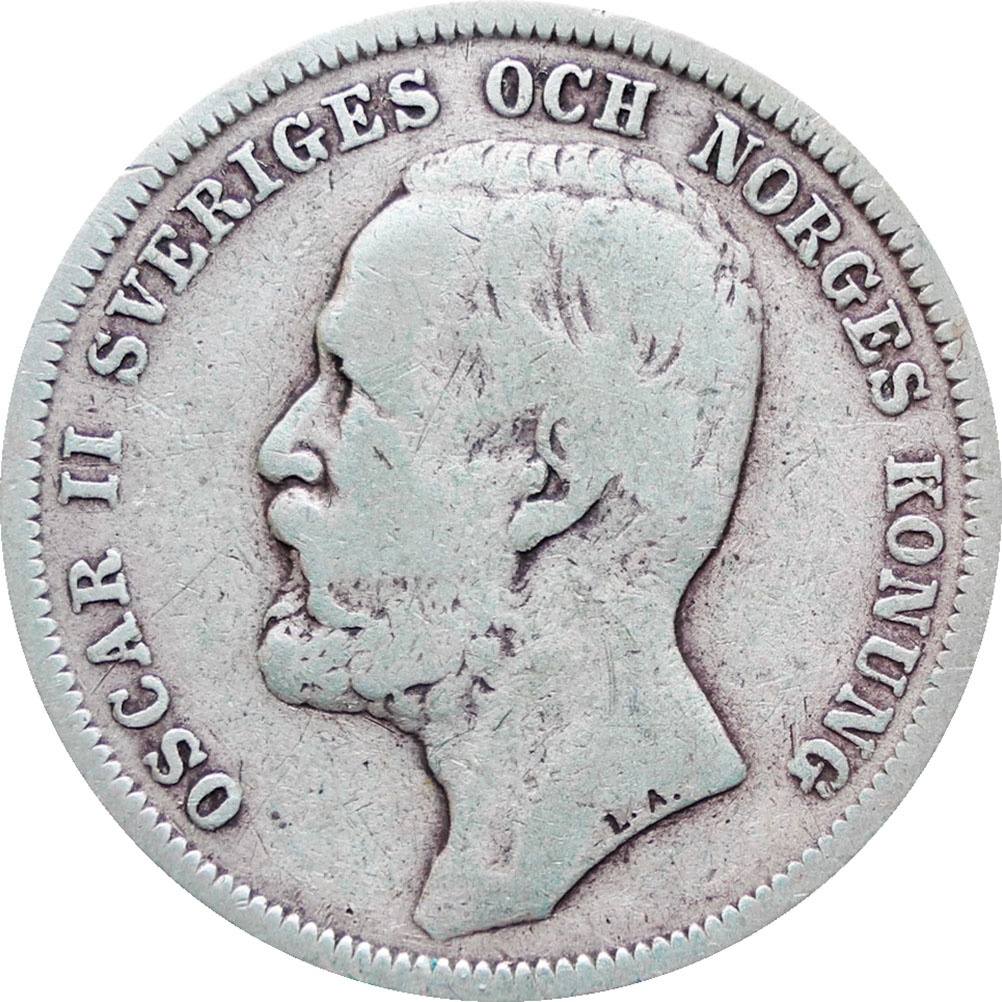 Obverse legend: “OSCAR II SVERIGES OCH NORGES KONUNG LA”